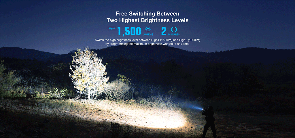 • Customizable Brightness: The innovative Dual Mode Setting Switch allows the user to choose their preferred high brightness level by simply reprogramming the light to either High 1 (1,500lm) or High 2 (1,000lm).
