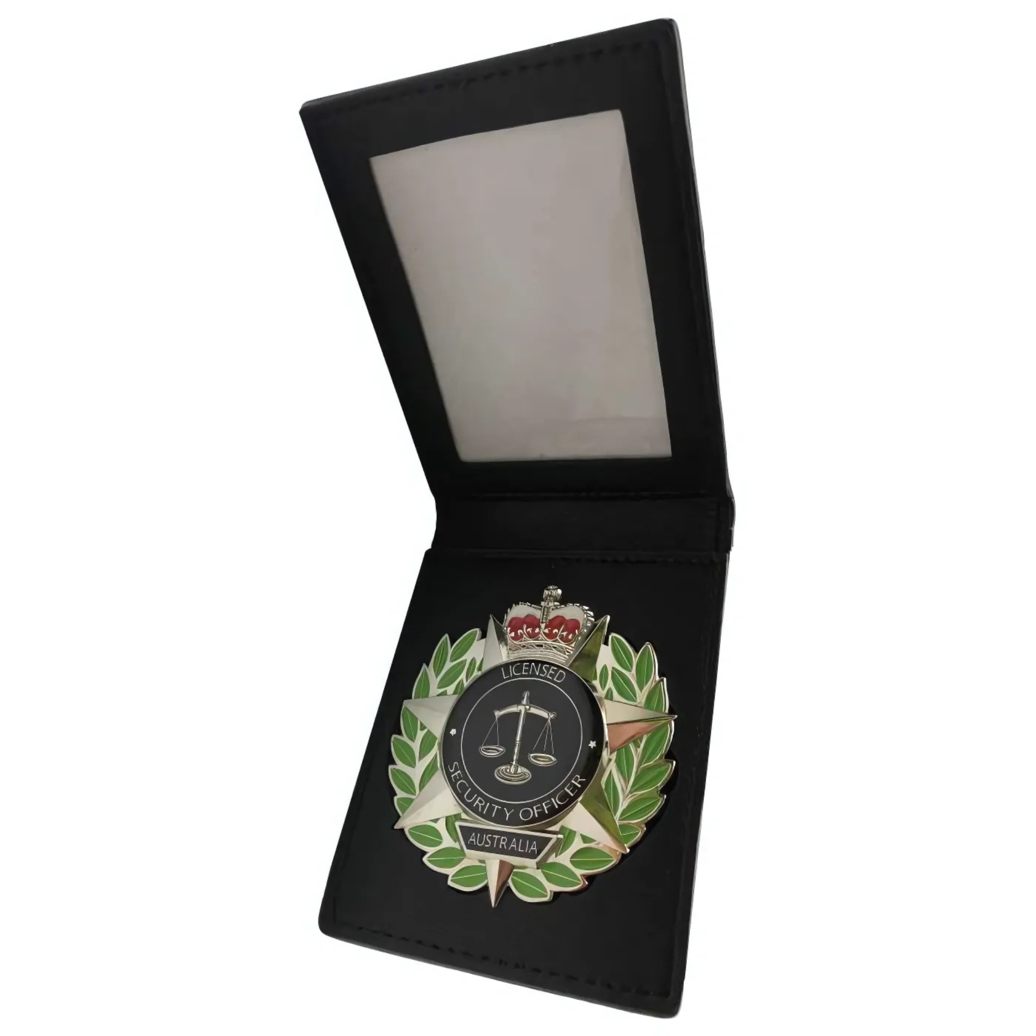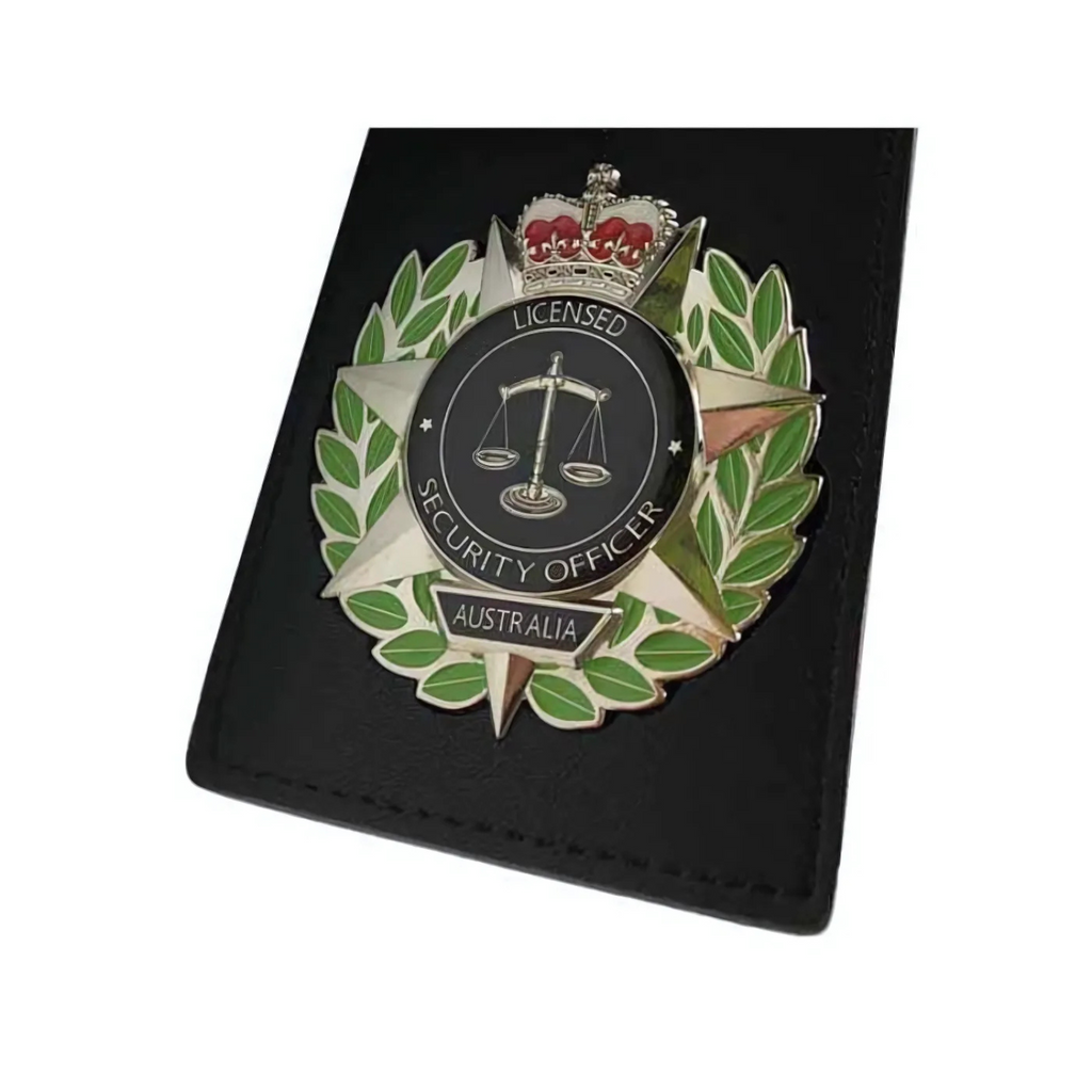 Distinctive Design: Green leaf wreath surrounds the centre for contrast, highlighting the silver "Licensed Security Officer Australia" text.