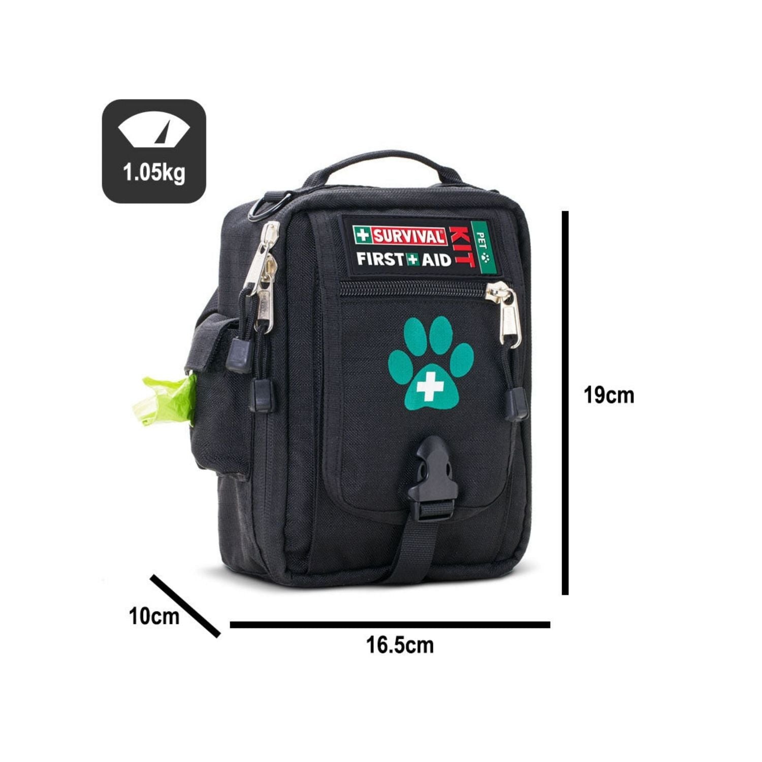 Eco-friendly poop bags, thermometer, wipes, and shears included