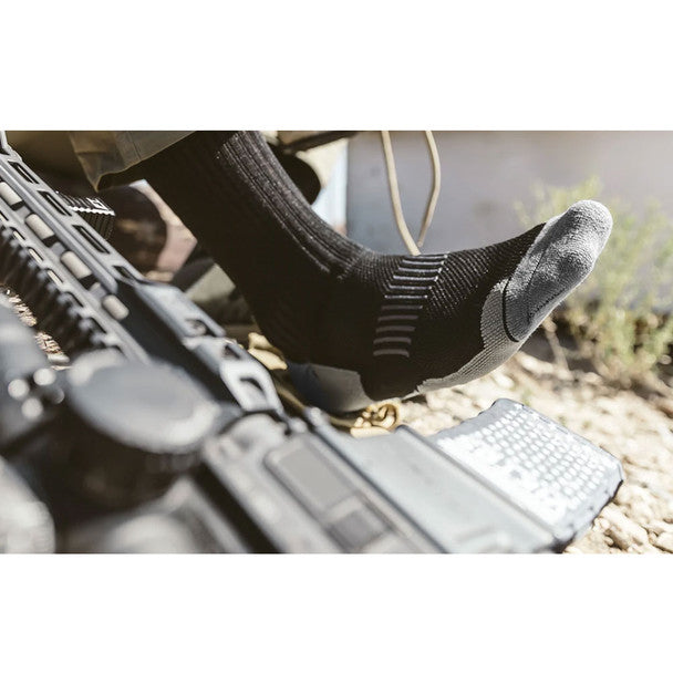 The Johnny Combat Boot Sock's Coolmax moisture-wicking knit chassis accelerates the evaporation of sweat helping keep you cooler and drier. The vented instep helps further reduce heat. The sock's compression helps to increase recovery and reduce the achiness and fatigue of physical training. Overall comfort is enhanced with a cushioned footbed and embedded arch support to reduce felt impact and is enhanced with ScentBlock anti-microbial treatment to prevent bacteria formation and odor.
